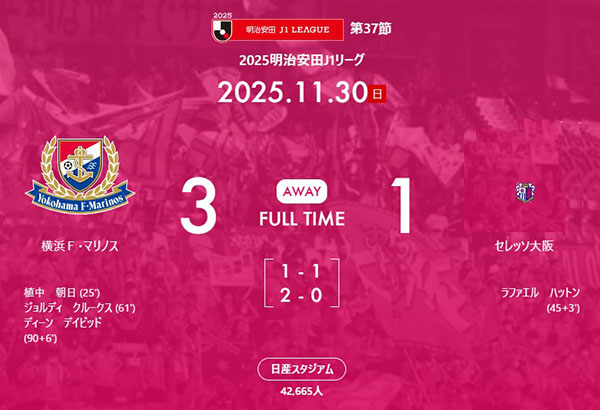 試合はそのまま1-3でマリノスの勝利で試合終了