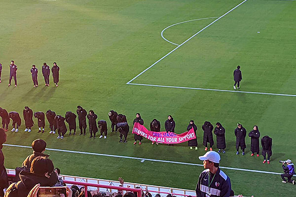 ゴール裏はビッグフラッグと弾幕が掲げられ選手達を迎えた