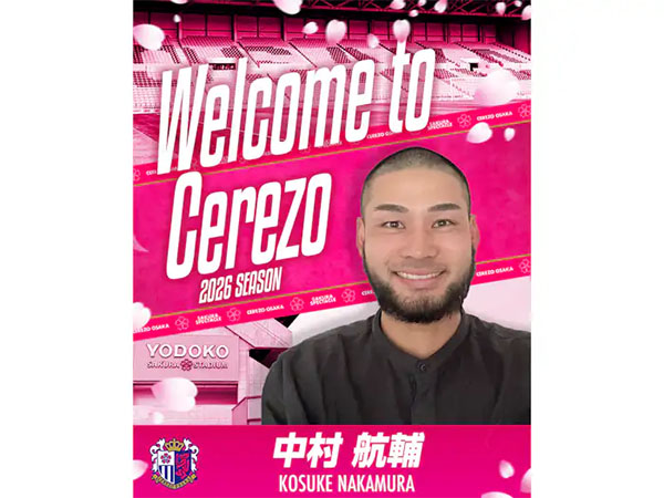 「セレッソ大阪に関わるすべての皆様、はじめまして。中村航輔です。このたび、偉大な歴史と伝統を持つセレッソ大阪に加入できたことを、大変光栄に思っております。クラブの一員として、日々全力で取り組み、チームの勝利に貢献できるよう努力してまいります。どうぞよろしくお願いいたします」