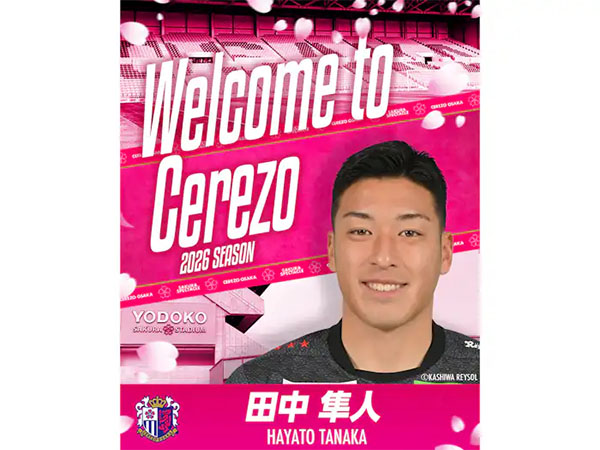 「はじめまして。柏レイソルから移籍してきました、田中隼人です。セレッソ大阪の魅力的で攻撃的なサッカーに貢献できるよう、日々精進していきます。皆様の前でプレーできることを楽しみにしています。よろしくお願いします!」