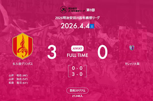 しかし後半16分に名古屋に3点目を決められ事実上の終戦!
